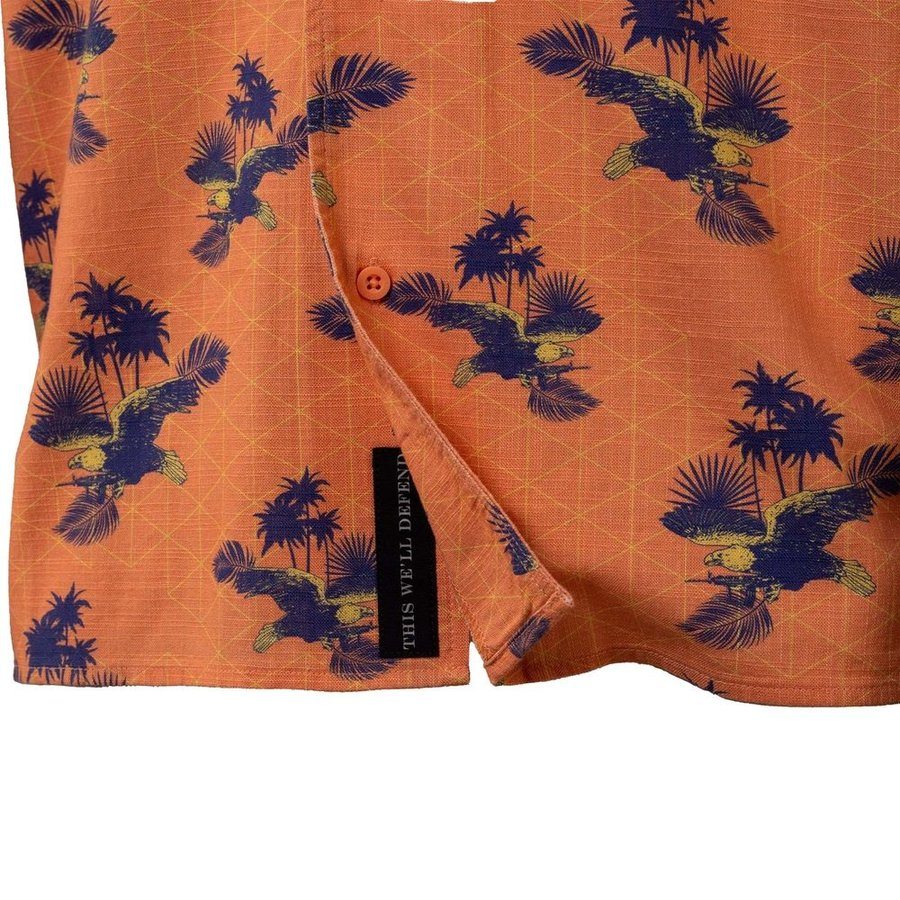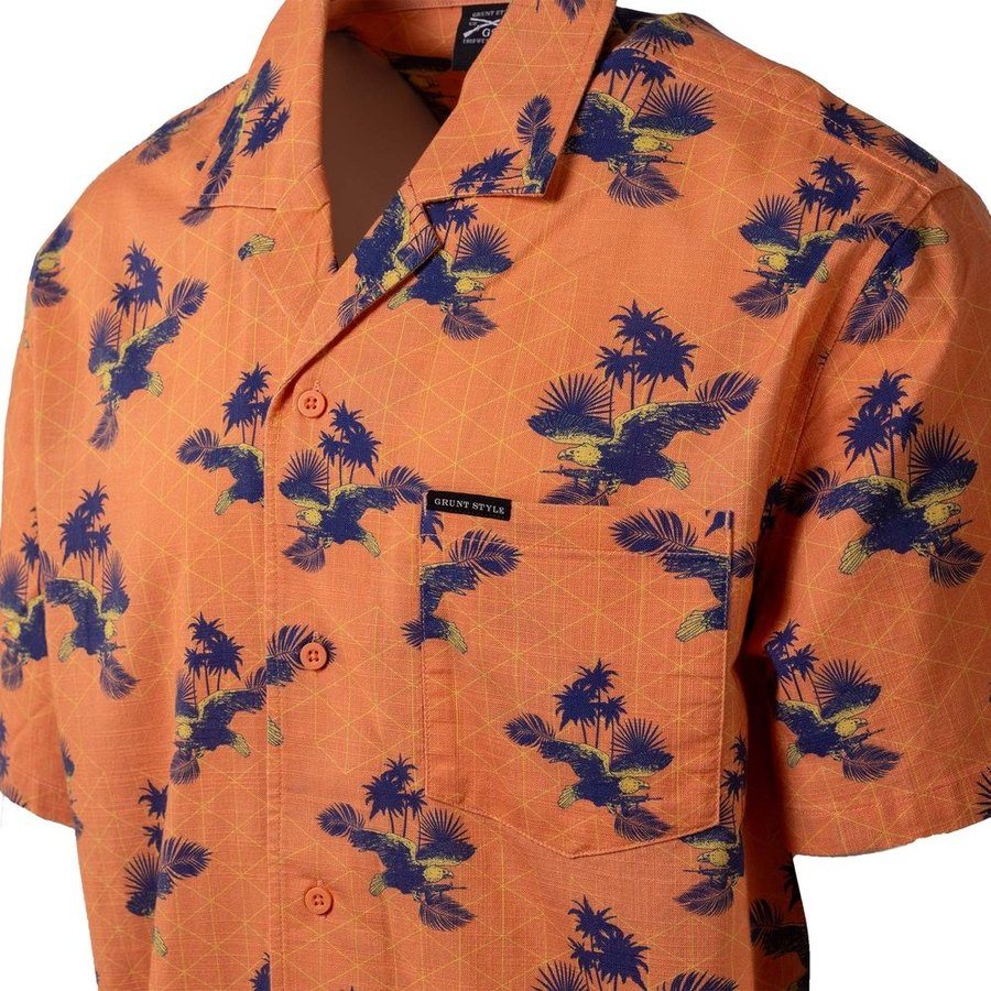 Embrace your bold American spirit with the Getaway Americaw Button Down in Orange by Grunt Style. This shirt is for those who wear their pride on their sleeve and live life loud. Featuring a stunning orange color paired with the powerful Americaw pattern, this button-down celebrates freedom, strength, and patriotism.